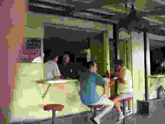 the counter or at tables against the wall. The billiard players at the back